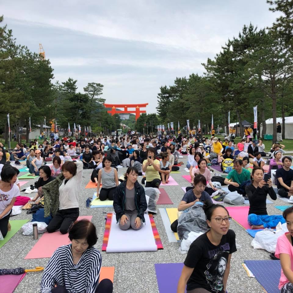 振り返ると、広い参道にひとひとひと!です。始まりは、みんなで一緒にヨガのポーズをしました!