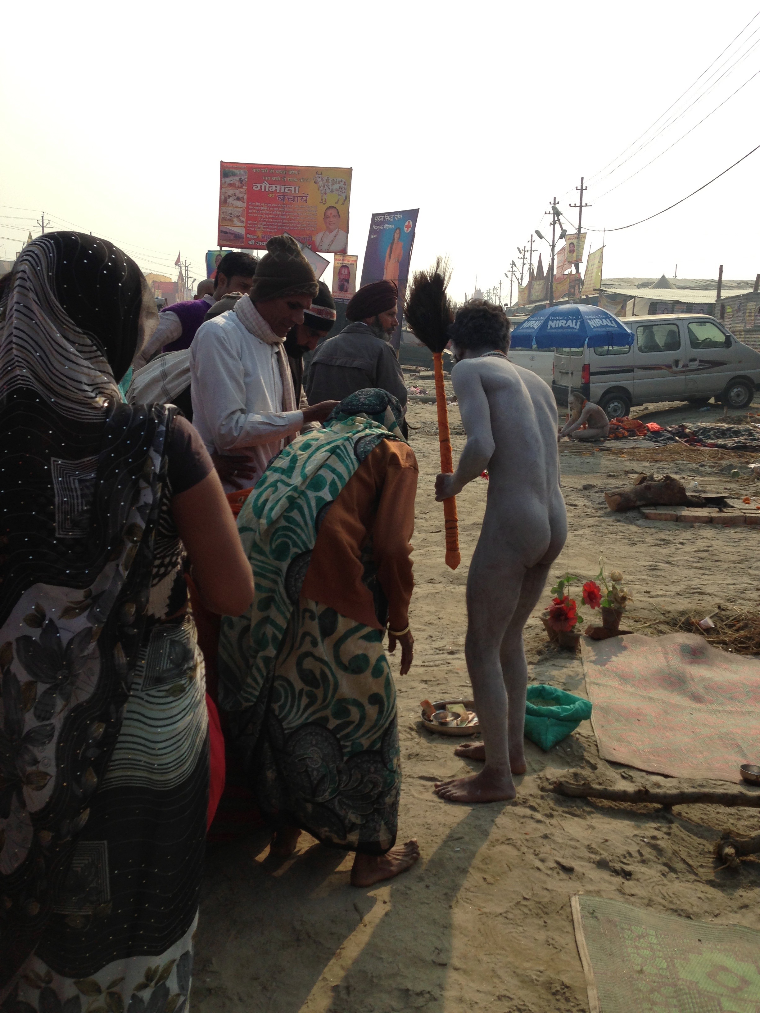 こちらは灰を体に塗りたくった聖者が持つ孔雀の羽で頭をポンポンと叩かれる→祝福を受ける。を列に並んで待つ人たち。