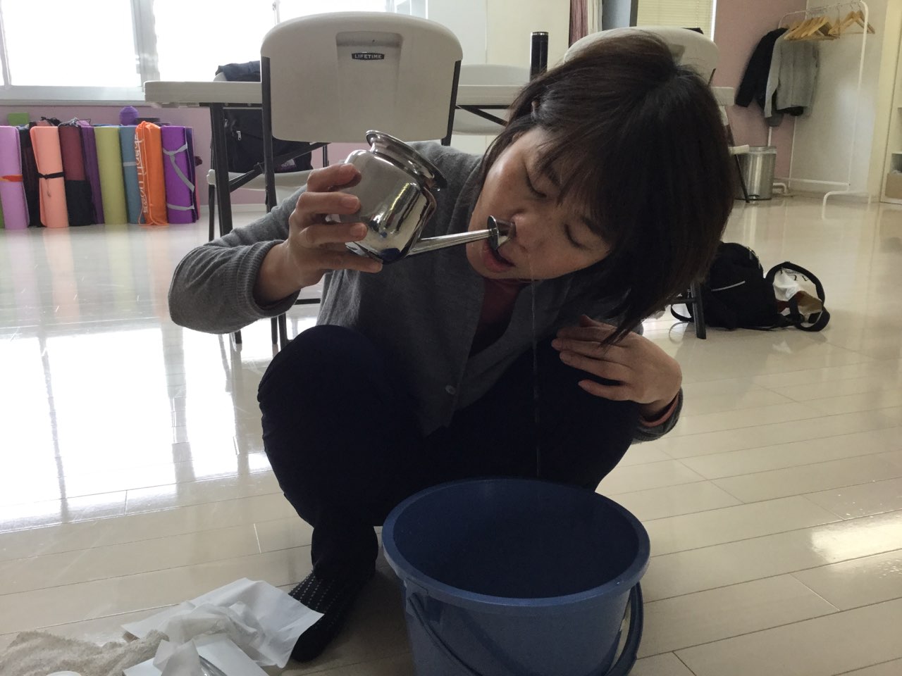 スタジオではジャンネティ(鼻うがい)の練習をしています。ヨガをするひとみんなに必要なジャンネティ、正しいやり方があります。