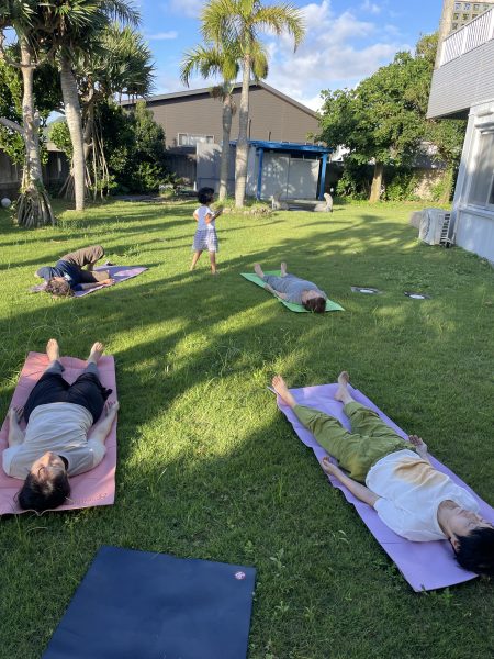 晴れた日は芝生で朝ヨガを。