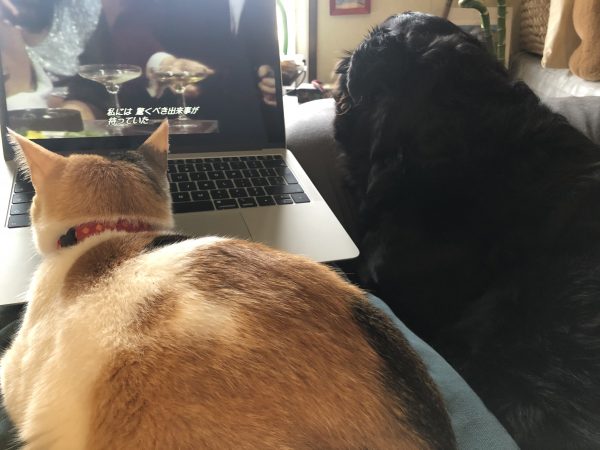 自宅で映画を観ていると、猫が膝に、犬が横にひっついてきます。出なくていいって楽だ。