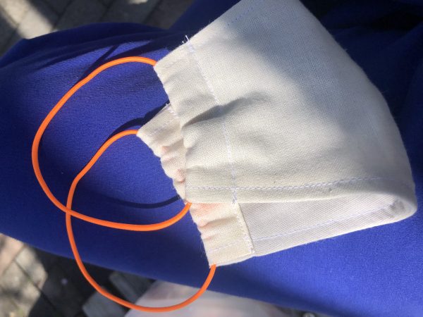 手島さんのヘンプマスクに蛍光オレンジのゴムをつけました。マスクもいろいろでいいよねー。