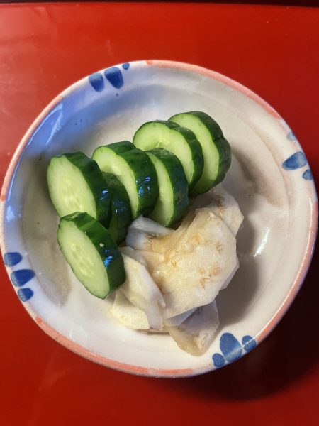 糠床を作るのに、気温は25℃くらいがいいらしく、まだ暑い時期から始めたので、1週間で早めに熟成(っていうのかな?)したよう。その間、朝夕に糠の天地を返すように混ぜるのですが、混ぜたその手が、光って見えてきれいになる。いい香りもするし、糠っていいね。