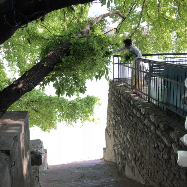 写真は、リシケシ、奥はガンジス川。若いお坊さんがお祈りに使うのか?葉を集めています。