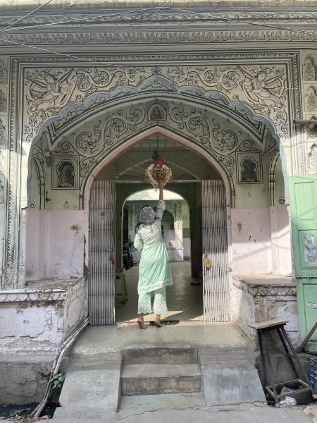 門には神様がいたりして。神様にお花を飾る女性。