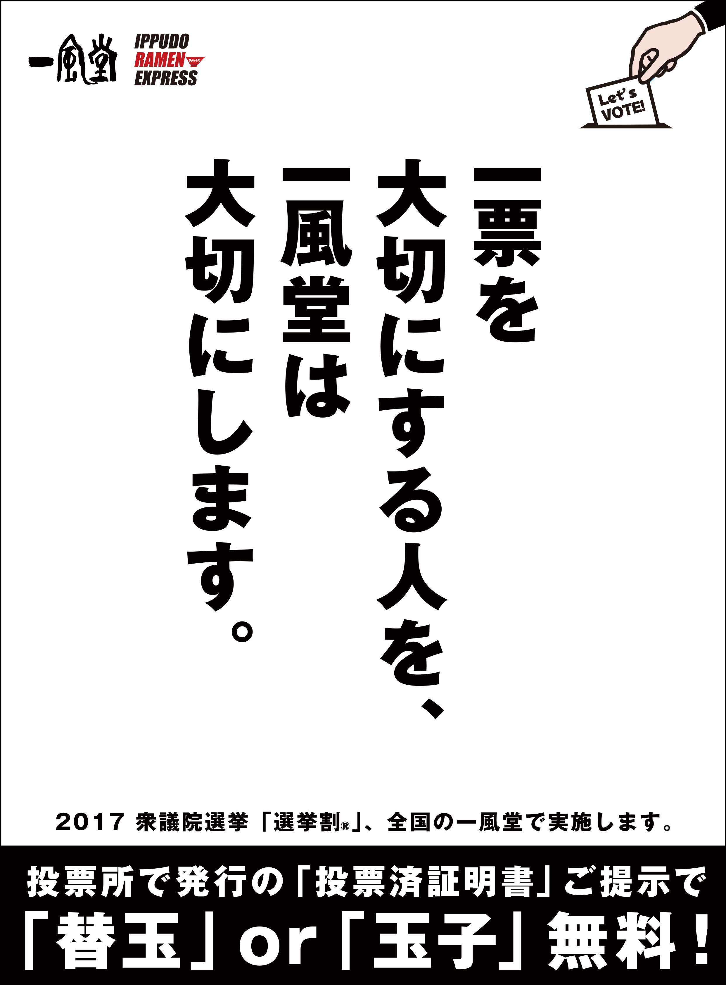 全国の一風堂で!という私は食べるものがないのですが。選挙割なくても選挙行くもんっ。